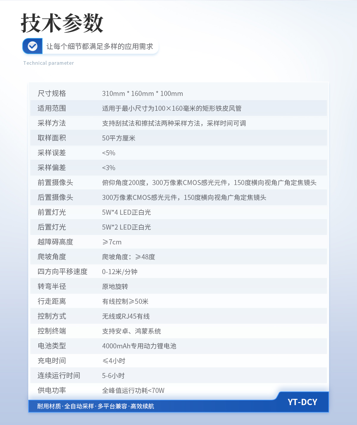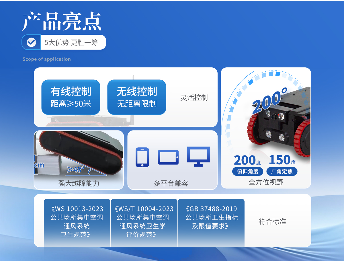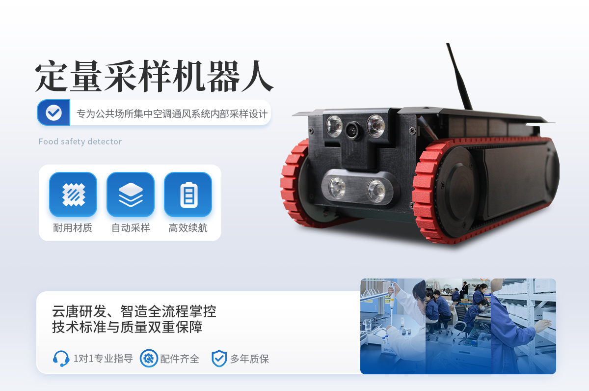 合規(guī)性:完全符合《WS 10013-2023》、《WS/T 10004-2023》及《GB 37488-2019》中對(duì)集中空調(diào)定量采樣機(jī)器人的要求。 緊湊設(shè)計(jì):尺寸長寬高310mm * 160mm * 100mm,可進(jìn)入*小尺寸為100×160毫米的矩形鐵皮風(fēng)管內(nèi)部進(jìn)行采樣。 精準(zhǔn)采樣:提供刮拭法和擦拭法兩種采樣方法,采樣器取樣面積50平方厘米,密閉雙采樣器加裝氣流回風(fēng)道,并使用光固化3D打印技術(shù)制造,保障了采樣面積的有效性。布條和擁有專利設(shè)計(jì)的刮板夾安裝方便快捷,現(xiàn)場操作時(shí)可**限度地杜絕二次污染,實(shí)現(xiàn)無菌操作。采樣誤差小于5%,采樣偏差小于3%。 全方位視野:前置攝像頭俯仰角度達(dá)200度,前后均采用150度廣角定焦攝像頭,提供無死角視野。 靈活控制:支持無線與有線兩種控制方式,有線控制距離≥50米,無線控制無距離限制。視頻采集、拍照及機(jī)器人控制均由終端完成。 強(qiáng)大越障能力:越障礙高度≥7cm,爬坡角度≥48度,整機(jī)含電池工作重量僅為4.0KG。 全自動(dòng)采樣:軟件控制加入了《集塵量采樣》與《微生物采樣》的全自動(dòng)一鍵采樣功能,無需人工干預(yù)即可完成所有采樣動(dòng)作。 耐用材質(zhì):整機(jī)不低于95%的材料使用航空鋁合金,表面經(jīng)過氧化噴砂處理并增厚鈍化膜,增加表面硬度。機(jī)體行走模塊一體成型,總重不超過4KG。 多平臺(tái)兼容:支持安卓系統(tǒng)、鴻蒙系統(tǒng)的手機(jī)、平板、電腦進(jìn)行控制操作。 **續(xù)航:配備4000mAh容量的動(dòng)力電池,充電時(shí)間≤4小時(shí),單次充電后可持續(xù)運(yùn)行約5-6小時(shí)。