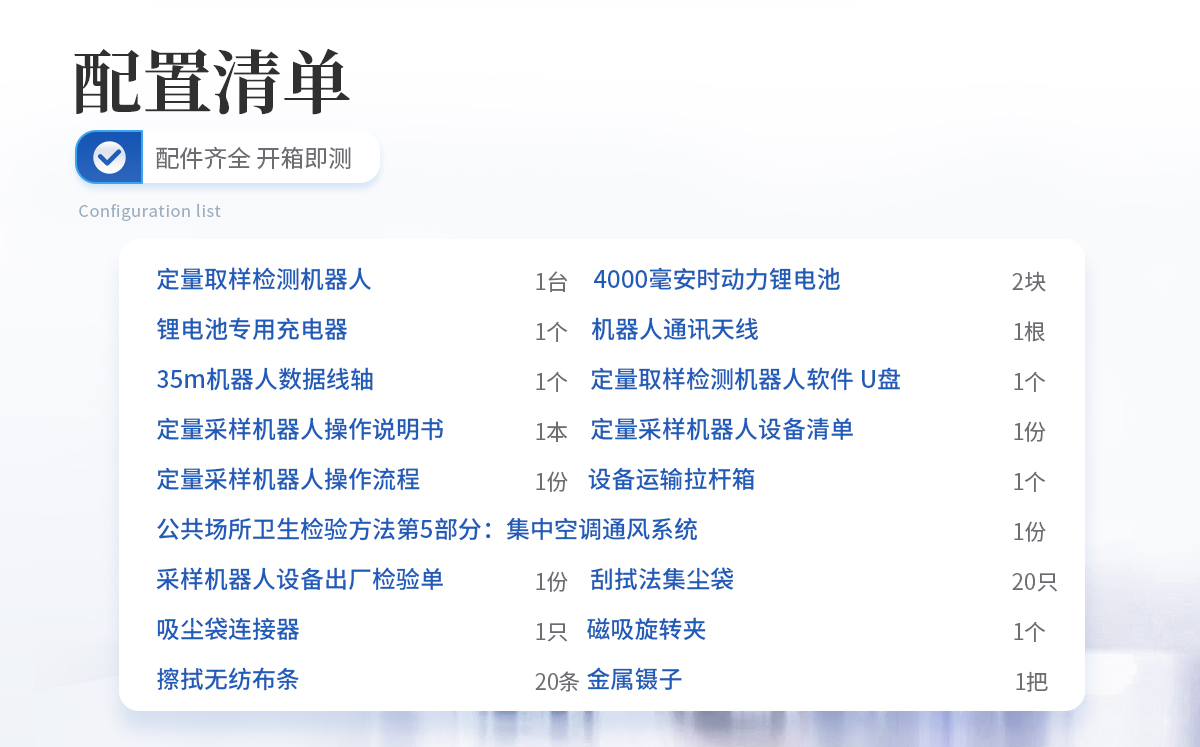 定量取樣檢測機(jī)器人:1臺(tái) 4000毫安時(shí)動(dòng)力鋰電池:2塊 鋰電池專用充電器:1個(gè) 機(jī)器人通訊天線:1根 35m機(jī)器人數(shù)據(jù)線軸:1個(gè) 定量取樣檢測機(jī)器人軟件 U盤:1個(gè) 定量采樣機(jī)器人操作說明書:1本 定量采樣機(jī)器人設(shè)備清單:1份 定量采樣機(jī)器人操作流程:1份 公共場所衛(wèi)生檢驗(yàn)方法第5部分:集中空調(diào)通風(fēng)系統(tǒng):1份 采樣機(jī)器人設(shè)備出廠檢驗(yàn)單:1份 刮拭法集塵袋 :20只 吸塵袋連接器 :1只 磁吸旋轉(zhuǎn)夾:1個(gè) 擦拭無紡布條 :20條 金屬鑷子:1把 設(shè)備運(yùn)輸拉桿箱:1個(gè)