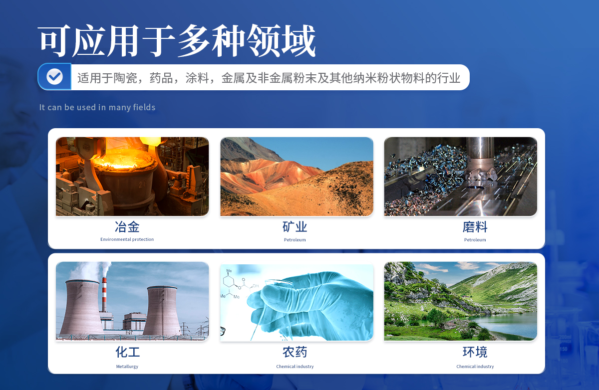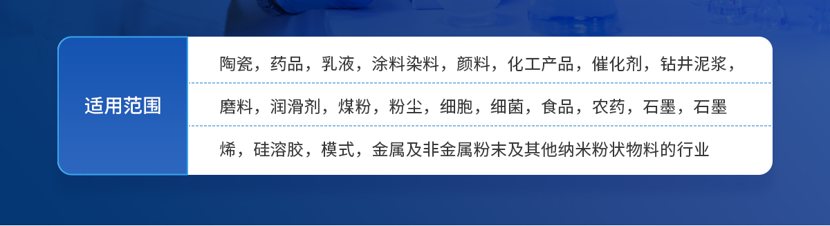 YT-JLGS-1200廣泛應用于水泥、陶瓷、藥品、乳液、涂料、染料、顏料、填料、化工產品、催化劑、鉆井泥漿、磨料、潤滑劑、煤粉、泥砂、粉塵、細胞、細菌、食品、添加劑、農藥、炸藥、石墨、感光材料、燃料、墨汁、金屬與非金屬粉末、碳酸鈣、高嶺土、水煤漿及其他粉狀物料。
