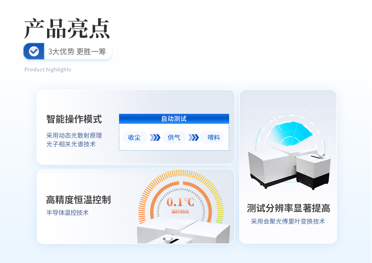 | 干濕一體化設計:本款儀器將濕法與干法測試集成于一體,成功解決了干濕法一體化的各項技術問題,能夠實現干濕一鍵切換,使用快捷方便,是**顆粒測試、研究的**選擇。 | 全內置分散系統:使用大功率循環泵,對管路進行優化設計,使整體控制協調性達到**水平,有效的防止了大顆粒的二次沉淀。 | 無約束自由擬合技術:運用無約束自由擬合技術,粒度分析不受任何函數的限制,可真實反映顆粒的分布狀態。 | 光路設計:采用會聚光傅立葉變換技術,使散射光不受透鏡孔徑限制;采用雙譜面光路設計,有效擴大測量范圍至1200微米;雙激光正交光路使用半導體輔助激光器測量側向散射0.0155度至164度,將測量范圍進一步擴展。 |