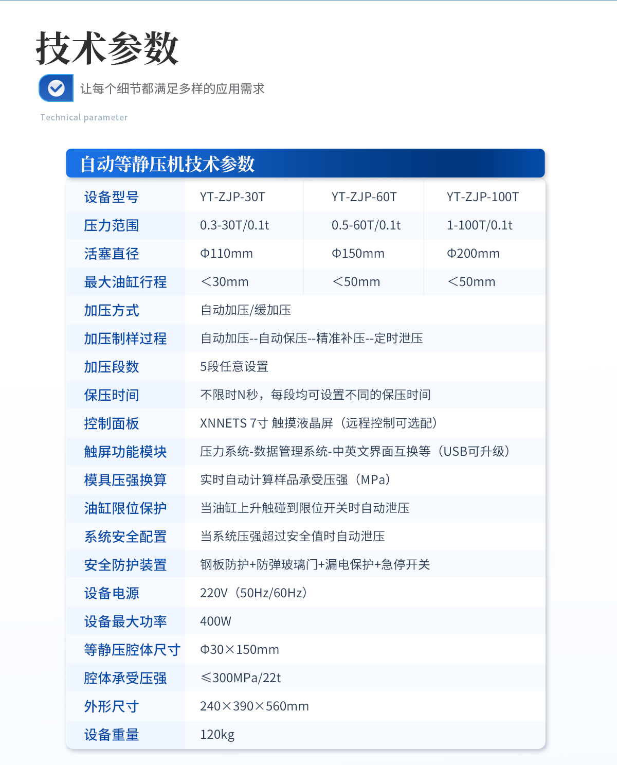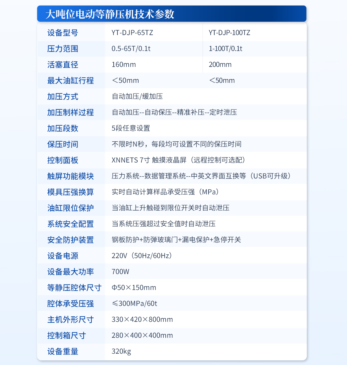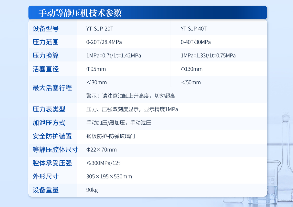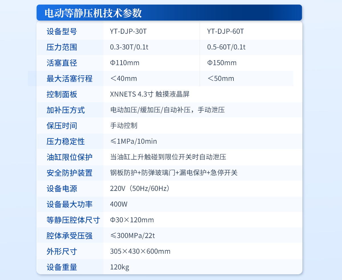 | 規格型號:YT-ZJP-100T | 壓力范圍:1-100T/0.1t | 活塞直徑 :Φ200mm | **油缸行程:<50mm | 加壓方式:自動加壓/緩加壓 | 加壓制樣過程:自動加壓--自動保壓--精準補壓--定時泄壓 | 加壓段數:5段任意設置 | 保壓時間 :不限時N秒,每段均可設置不同的保壓時間 | 控制面板:XNNETS 7寸 觸摸液晶屏(遠程控制可選配) | 觸屏功能模塊: 壓力系-統-數據管理系統--中英文界面互換等(USB可升級) | 模具壓強換算:實時自動計算樣品承受壓強(MPa) | 油缸限位保護:當油缸上升觸碰到限位開關時自動泄壓 | 系統安全配置 :當系統壓強超過安全值時自動泄壓 | 安全防護裝置:鋼板防護+防彈玻璃門+漏電保護+急停開關 | 設備電源:220V(50Hz/60Hz) | 設備**功率:400W | 等靜壓腔體尺寸:Φ60×150mm | 腔體承受壓強: ≤300MPa/87t | 外形尺寸:330×580×720mm | 設備重量:290kg | 配置說明:等靜壓機1臺!可根據需求定制500MPa等靜壓機或橡膠模具 |