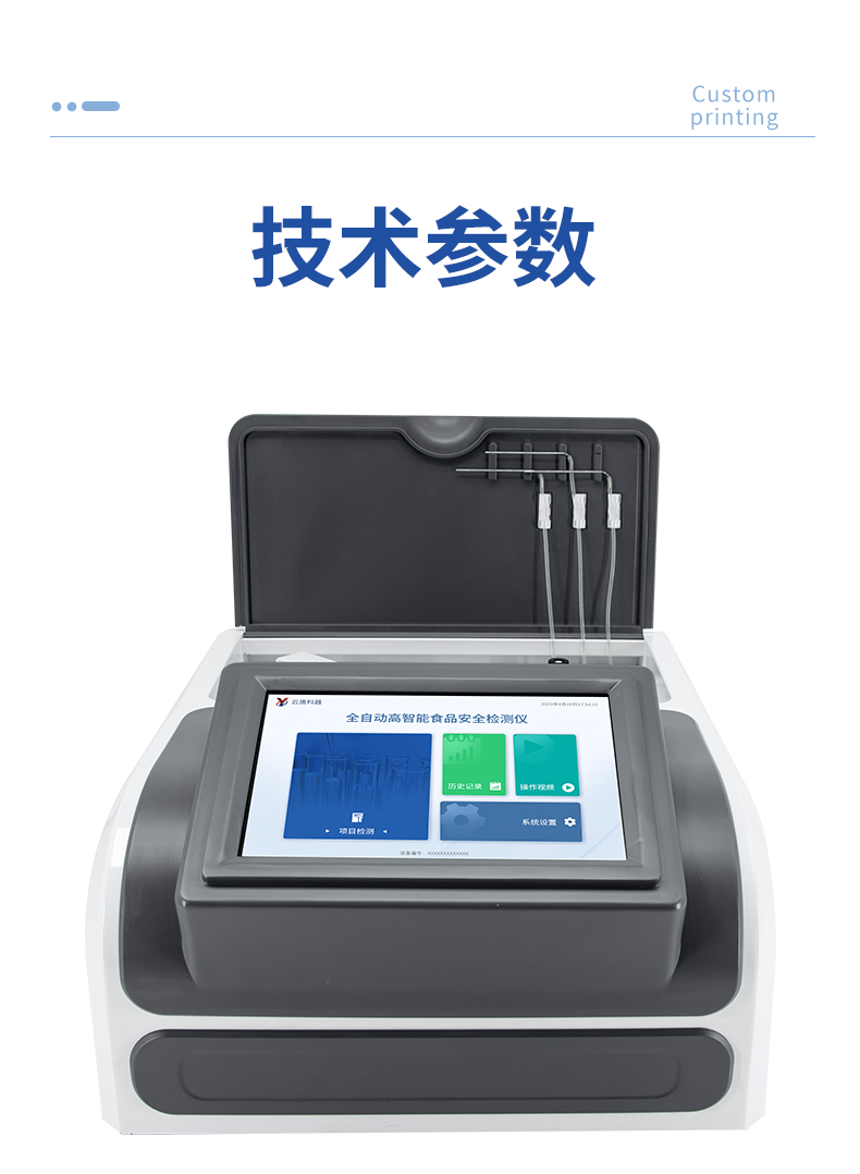 | 1. 試劑位置:3個 | 2. 檢測形式:旋轉48通道比色盤,可任意選擇檢測通道,自動對應選擇通道。 | 3. 系統配置:10.1寸高清液晶觸摸屏,采用ARM Cortex-A7,RK3288/4核處理器,運行內存1GB。Android7.1.1 系統分辨率1280×800。 | 4.恒溫系統:具有自動加溫溫控系統,精準恒溫37℃,精度±0.1℃。 | 5.添加系統:儀器按照試劑要求自動、按時、按量加入試劑,并且自動對未正常放置的樣本或異常的樣本進行檢查并提示。 | 6.清洗功能:儀器具備回流及自動清洗管路功能,避免試劑污染。 | 7.混勻功能:設備具備自動混勻功能。 | 8.光源校準:設備可自動校準,確保檢測準確度。 | 9.實時監控:儀器測試過程中屏幕顯示運行狀態,可實時查看。 | 10.數據存儲:內部存儲16GB,可存儲500萬條數據。 | 11.樣品多選功能:設備具備樣品一鍵多選功能,選擇樣品自動匹配檢測通道。 | 12.項目預設:可提前設置單個及多個相同或不相同的檢測任務,可單次或者多次調取,減少檢測時間。 | 13.自定義打印系統:內置自定義打印系統,可按需靈活設置開啟或關閉:產品合格證(國家農業部標準),二維碼,抽樣信息、檢測信息,受檢信息等信息的打印。 | 14.A4版本報告打印功能:設備可自動生成A4版報告,A4報告帶二維碼,可掃描二維碼生成電子版,并可識別真偽。 | 15.傳輸方式:儀器配備無線通信模塊: 4G(APN)通訊模塊、Wifi模塊,藍牙傳輸模塊,同時具有USB接口以及RJ45接口能以多種方式實現數據保存和數據傳輸功能,設備數據可以同步上傳至平臺。 | 16.數據監管系統:設備自帶監管平臺,并可同步對接監管平臺,數據可局域網和互聯網數據上傳,檢測結果可直接傳至食品安全監管平臺。達到食品安全問題預估、預警。 | 17.系統遠程更新功能:無需設備返廠,即可遠程實時升級全新系統,節省時間成本及避免運輸造成設備損。 |