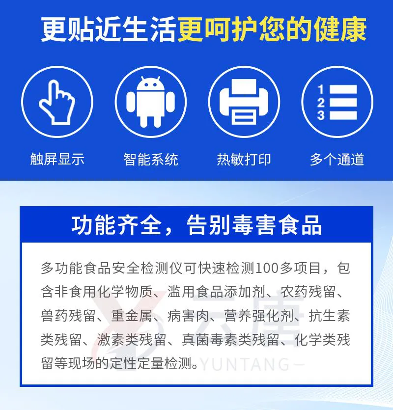 可快速檢測各類食品中的甲醛、吊白塊、二氧化硫、亞硝酸鹽、雙氧水、硼砂、農(nóng)藥殘留、乳及乳制品中蛋白質(zhì)的含量,儀器預(yù)留其他項(xiàng)目檢測程序和端口,根據(jù)日后需求可方便的自主增加檢測項(xiàng)目。