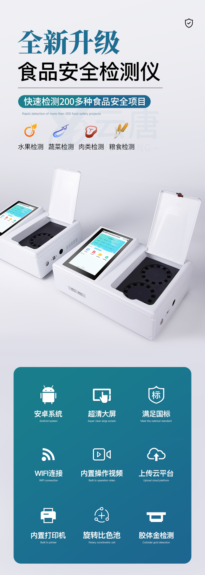 山東云唐智能科技有限公司生產(chǎn)的高智能食品安全檢測儀為集成化食品安全快速檢測分析設備,采用臺式一體化設計,可快速檢測200多種食品安全項目,包含非食用化學物質(zhì)、濫用食品添加劑、農(nóng)藥殘留、獸藥殘留、重金屬、病害肉、營養(yǎng)強化劑、抗生素類殘留、激素類殘留、真菌毒素類殘留、化學類殘留等項目的定性定量檢測。