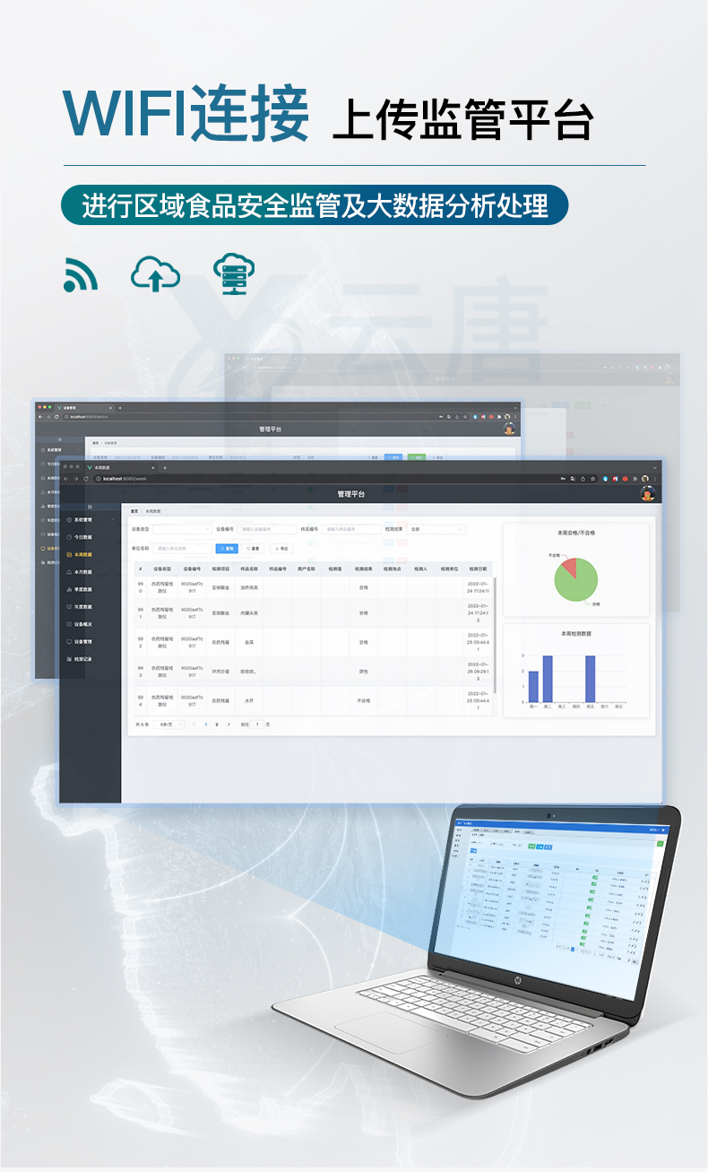 9.6、數(shù)據(jù)監(jiān)管系統(tǒng):同步對接監(jiān)管平臺,數(shù)據(jù)可局域網(wǎng)和互聯(lián)網(wǎng)數(shù)據(jù)上傳,檢測結果可直接傳至食品安全監(jiān)管平臺。進行區(qū)域食品安全監(jiān)管及大數(shù)據(jù)分析處理與數(shù)據(jù)統(tǒng)計,監(jiān)測區(qū)域食品安全長短期動態(tài)及問題預估、預警。