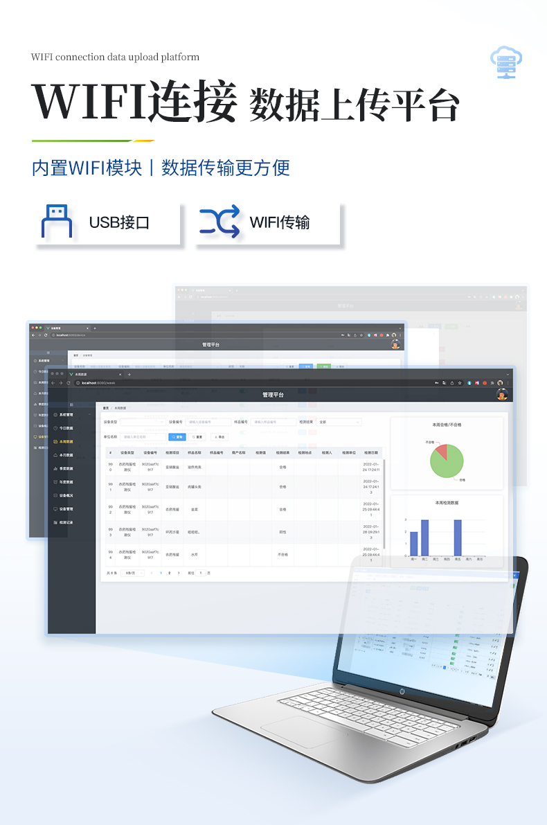8.3、數據監(jiān)管系統(tǒng):同步對接監(jiān)管平臺,數據可局域網和互聯網數據上傳,檢測結果可選擇直接傳至食品安全監(jiān)管平臺。進行區(qū)域食品安全監(jiān)管及大數據分析處理與數據統(tǒng)計,檢測區(qū)域食品安全長短期動態(tài),達到食品安全問題預估、預警。
