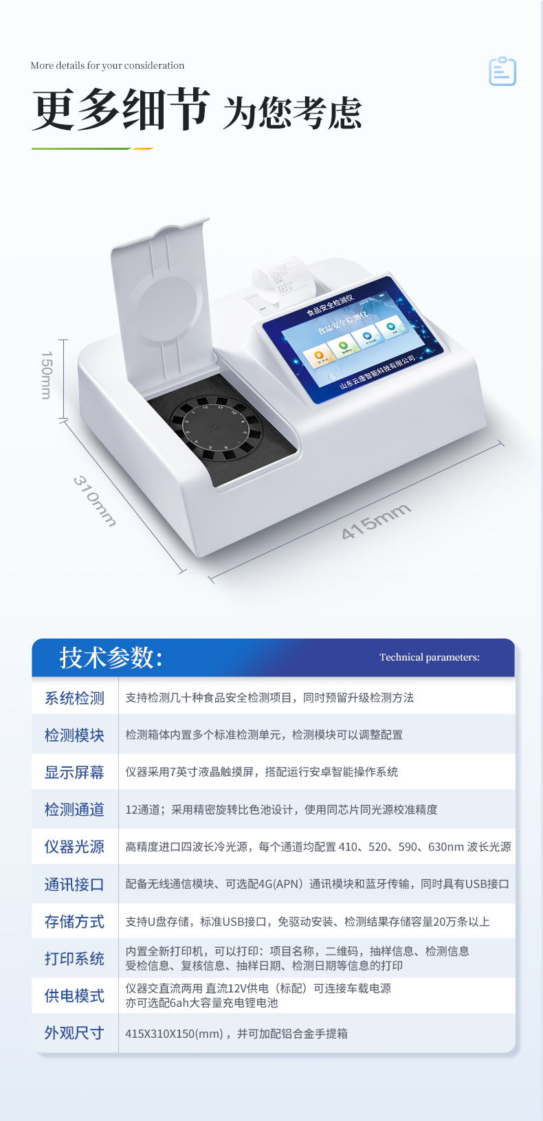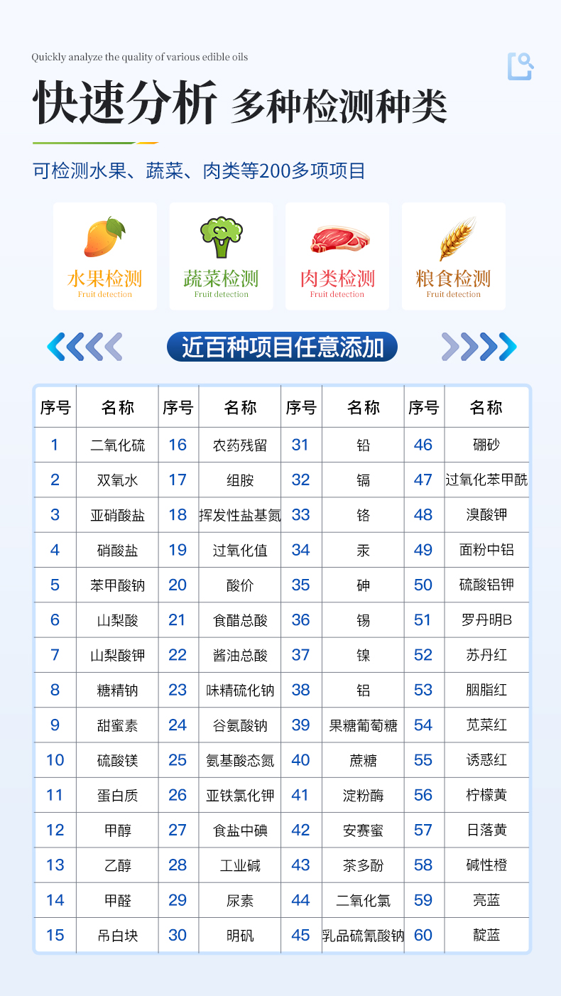 高精度食品安全檢測儀可快速檢測60多項目,包含:濫用食品添加劑、非食用化學物質、農藥殘留、重金屬含量、病害肉成分、營養(yǎng)強化劑、化學類殘留、食用油脂檢測、水酒飲品分析、調味品成分、食用色素等現場的定性定量檢測。