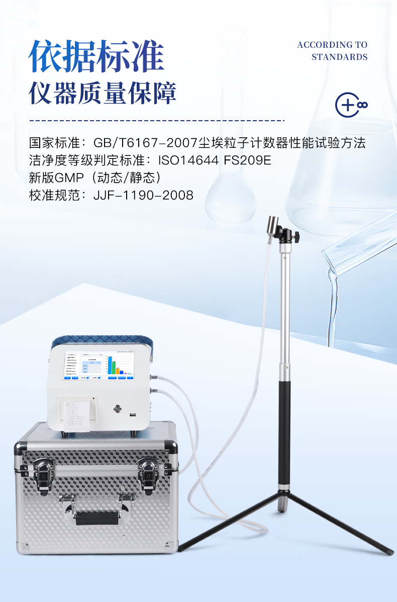 國家標準:GB/T6167-2007塵埃粒子計數器性能試驗方法 潔凈度等級判定標準:ISO14644 FS209E ,新版GMP(動態(tài)/靜態(tài)) 校準規(guī)范:JJF-1190-2008