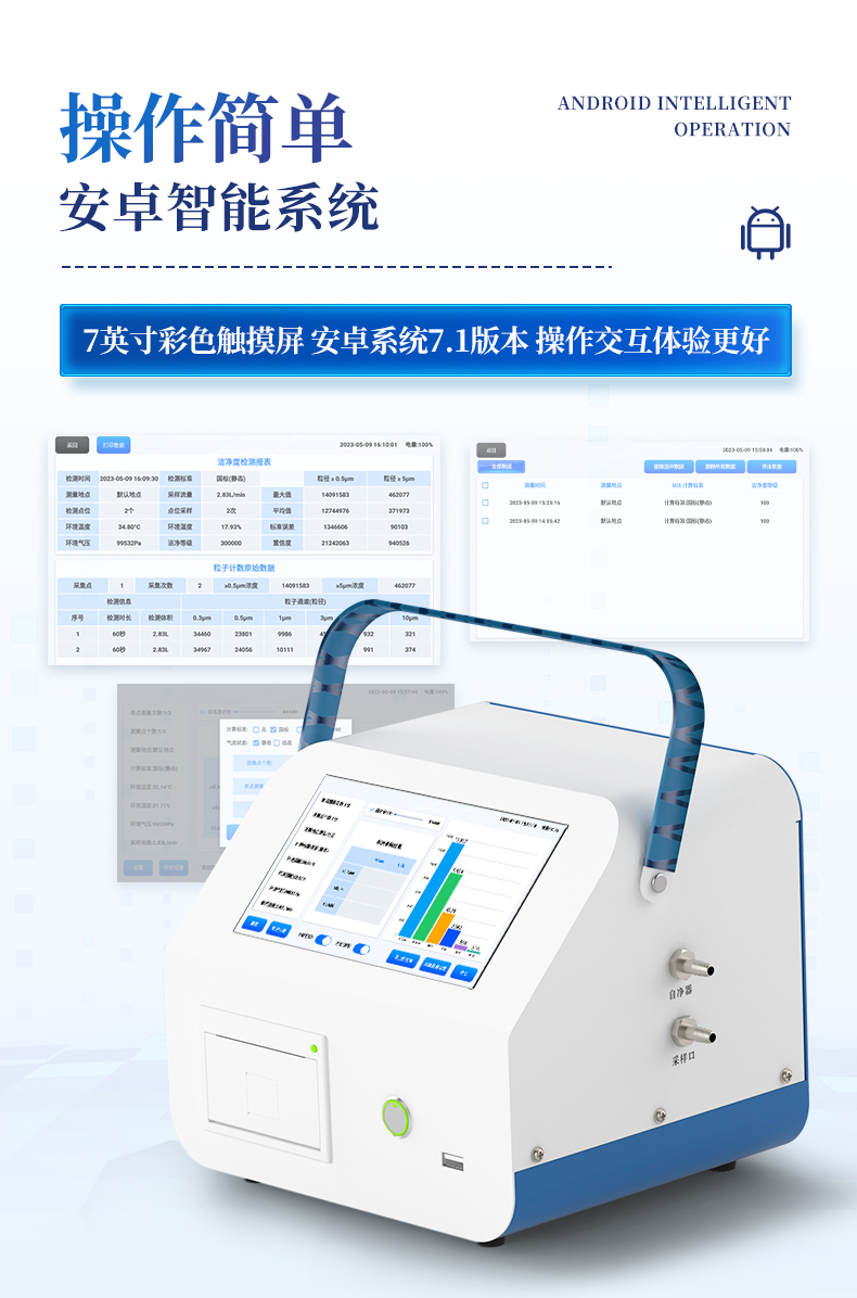 1、安卓系統(tǒng)7.1版本,操作交互體驗(yàn)更好。 2、內(nèi)置溫濕度傳感器、環(huán)境氣壓傳感器 3、核心部件光散射傳感器明顯消除腔體的雜散光,信噪比大為提高。從而使測(cè)量更準(zhǔn)確更可靠。 4、按95%置信度(UCL)計(jì)算,計(jì)數(shù)結(jié)果可換算成m3和ft3 5、依照凈化級(jí)別劃分和規(guī)定,自動(dòng)判定凈化級(jí)別,使用便利。 6、帶審計(jì)追蹤功能,可查詢、可追溯、可控制,符合FDA 21CFR PART11規(guī)范 7、支持wifi、藍(lán)牙傳輸,數(shù)據(jù)可無(wú)線上傳;同時(shí)支持U盤(pán)拷貝數(shù)據(jù),免驅(qū)動(dòng)插拔。 8、配置監(jiān)管平臺(tái),檢測(cè)結(jié)果可直接無(wú)線傳至平臺(tái),進(jìn)行潔凈度長(zhǎng)短期分析,輔助管理。 9、內(nèi)置新一代高速熱敏打印機(jī),可選擇所需要打印的粒徑通道,靈活打印結(jié)果。 10、交直流兩用,內(nèi)置充電鋰電池,環(huán)保耐用可支持連續(xù)采樣6小時(shí)以上。 11、便捷簡(jiǎn)易伸縮式云臺(tái)支架,安裝采樣操作更加方便。