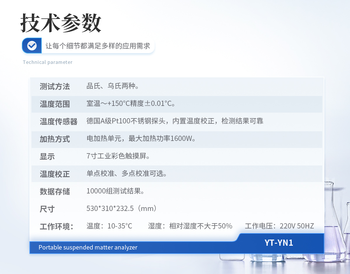 測試方法:品氏、烏氏兩種。 溫度范圍:室溫~+150°C精度±0.01°C。 溫度傳感器:德國A級Pt100不銹鋼探頭,內置溫度校正,檢測結果可靠。 加熱方式:電加熱單元,**加熱功率1600W。 顯示:7寸工業彩色觸摸屏。 溫度校正:單點校準、多點校準可選。 數據存儲:10000組測試結果。 尺寸:530*310*232.5(mm) 工作環境: 溫 度:10-35℃ 濕 度:相對濕度不大于50% 工作電壓:220V 50HZ