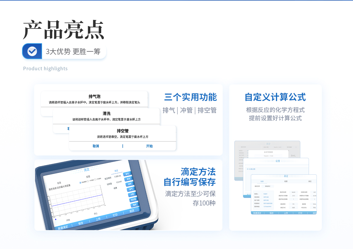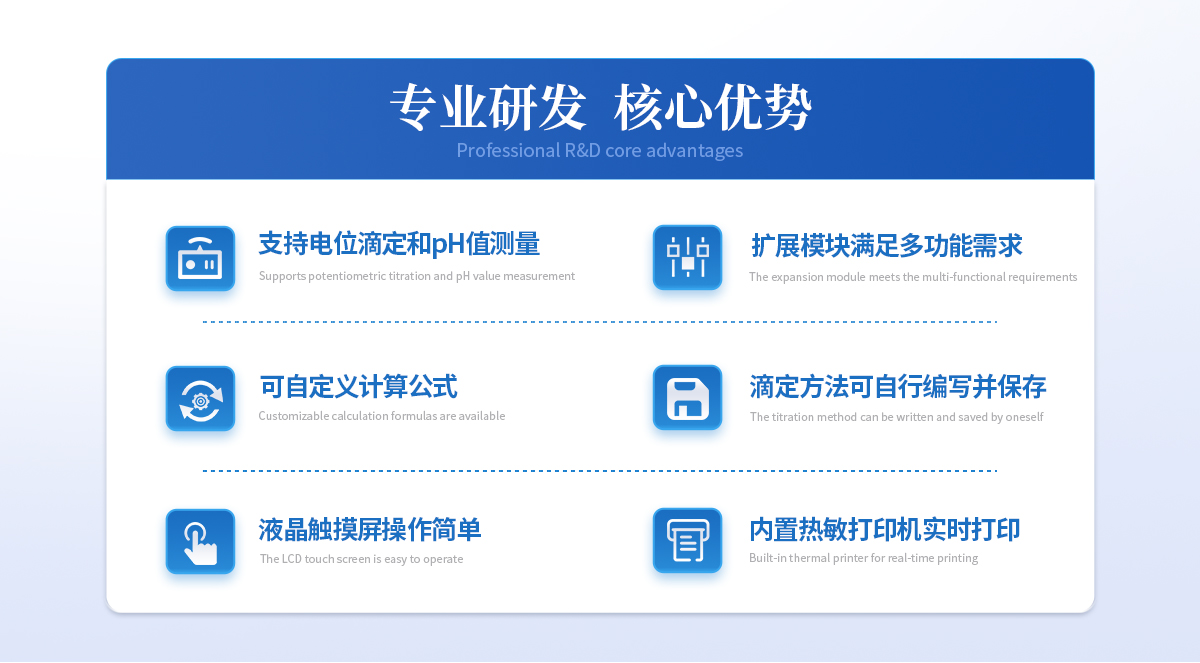 | 1、設(shè)備支持電位滴定和pH值測量;用戶選擇不同電極可進(jìn)行酸堿滴定、氧化還原滴定、沉淀滴定、絡(luò)合滴定等多種滴定和pH測量; | 2、用戶可選配電導(dǎo)滴定、永停滴定等擴(kuò)展模塊,滿足用戶多功能需求; | 3、設(shè)備對國家標(biāo)準(zhǔn)中采用的電位滴定法均滿足,用戶可根據(jù)檢測需求選擇適配的電極即可; | 4、支持動態(tài)滴定、等量滴定、手動滴定的滴定方式,可預(yù)設(shè)滴定終點(diǎn)或自動識別終點(diǎn)滴定,方便用戶根據(jù)樣品特性選擇**滴定工作流程; | 5、可自定義計算公式,根據(jù)反應(yīng)的化學(xué)方程式提前設(shè)置好計算公式,滴定完成后將自動獲得待測物含量; | 6、滴定方法可自行編寫并保存,形成滴定方法快捷模式,在使用時可直接選擇運(yùn)行,滴定方法至少可保存100種; | 7、設(shè)備可作為實(shí)驗(yàn)室常規(guī)手動滴定的滴定裝置使用;計量泵替代滴定管,磁力攪拌功能替代手動搖晃錐形瓶的工作; | 8、儀器實(shí)用的三個功能: (1)排氣,可將滴定管或管路內(nèi)的氣泡排出,避免氣泡帶來的滴定誤差; (2)沖管,可以*少的試劑消耗量使管路內(nèi)充滿試劑,實(shí)現(xiàn)節(jié)省試劑的同時減少試劑混合引入的滴定誤差; (3)排空管,可在實(shí)驗(yàn)完成后將管路中的液體收集到滴定管內(nèi),避免在拆卸管路時產(chǎn)生藥液濺灑問題。 |