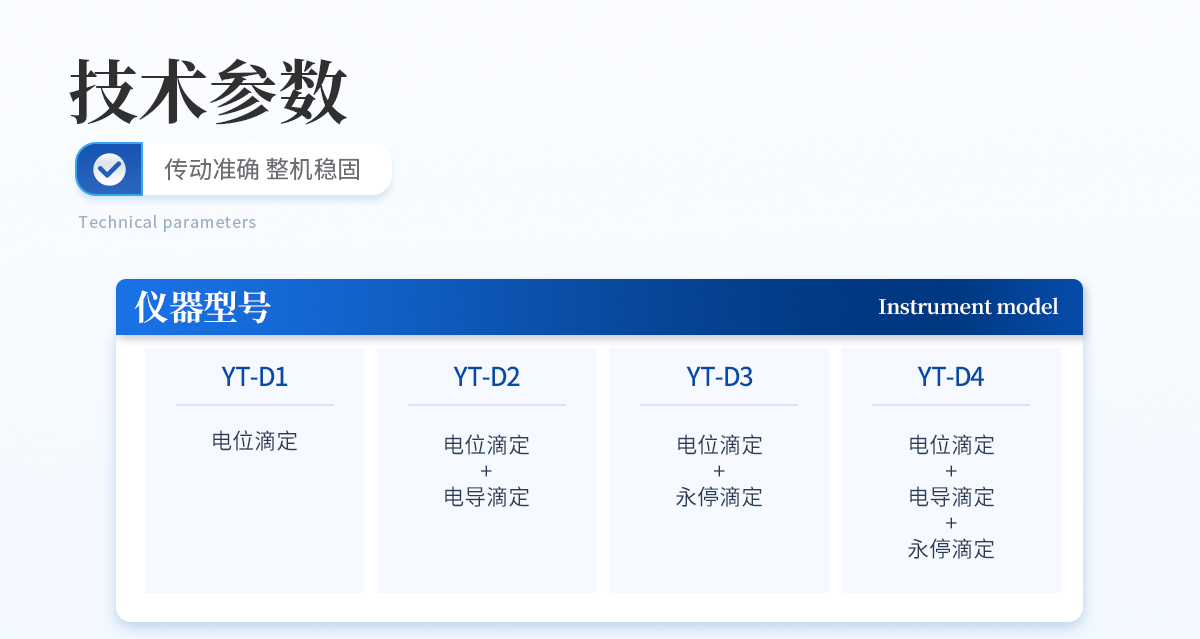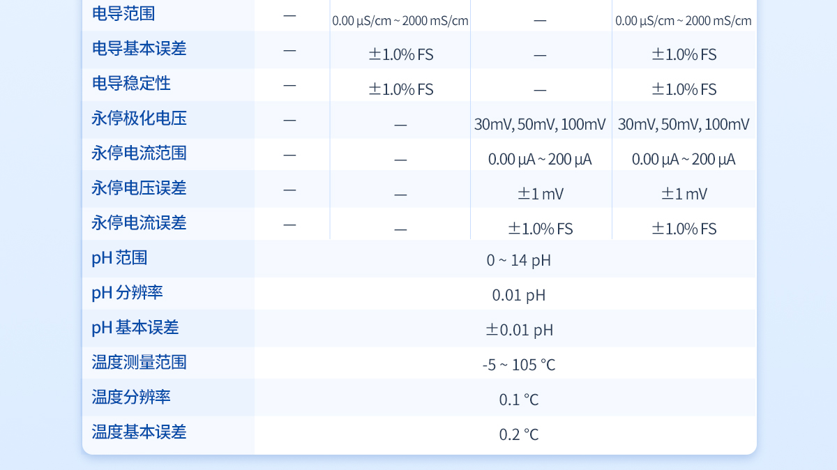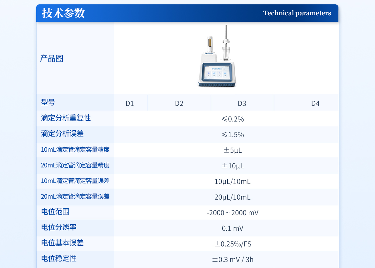 | 滴定分析重復(fù)性:≤0.2% | 滴定分析誤差:≤1.5% | 10mL滴定管滴定容量精度:±5μL | 20mL滴定管滴定容量精度:±10μL | 10mL滴定管滴定容量誤差:10μL/10mL | 20mL滴定管滴定容量誤差:20μL/10mL | 電位范圍:-2000—2000mV | 電位分辨率:0.1mV | 電位基本誤差mV:±0.25‰/FS | 電位穩(wěn)定性mV:±0.3mV/3h | 永停極化電壓:30mV、50mV、100mV | 永停電流范圍:0.00uA-200uA | 永停電壓誤差:±1mV | 永停電流誤差:±1.0% FS | pH范圍:0-14PH | pH分辨率:0.01PH | pH基本誤差:±0.01PH | 溫度測量范圍:-5 - 105℃ | 溫度分辨率:0.1℃ | 溫度基本誤差:0.2℃ |