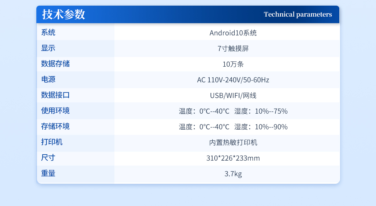 | 系統(tǒng):Android10系統(tǒng) | 顯示:7寸觸摸屏 | 數(shù)據(jù)存儲:10萬條 | 電源:AC 110V-240V/50-60Hz | 數(shù)據(jù)接口:USB/WIFI/網(wǎng)線 | 使用環(huán)境:溫度:0℃--40℃ 濕度:10%--75% | 存儲環(huán)境:溫度:0℃--40℃ 濕度:10%--90% | 打印機(jī):內(nèi)置熱敏打印機(jī) | 尺寸:310*226*233mm | 重量:3.7kg |