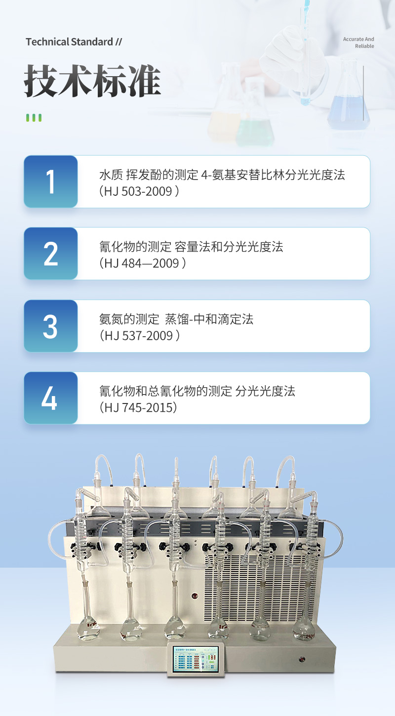 該儀器實驗了控溫、自動防倒吸、加熱均勻、防止暴沸、智能終點控制等功能。使用方便,節能環保。經過實驗室蒸餾回收率比對驗證,結果準確,回收率達95%以上。該儀器可廣泛適用于環保、疾控、水產、供排水、高校、科研院所、廠礦企業等各類化學實驗室需要蒸餾處理的場所,如揮發酚、氨氮、凱氏氮油中水分等項目的蒸餾處理。